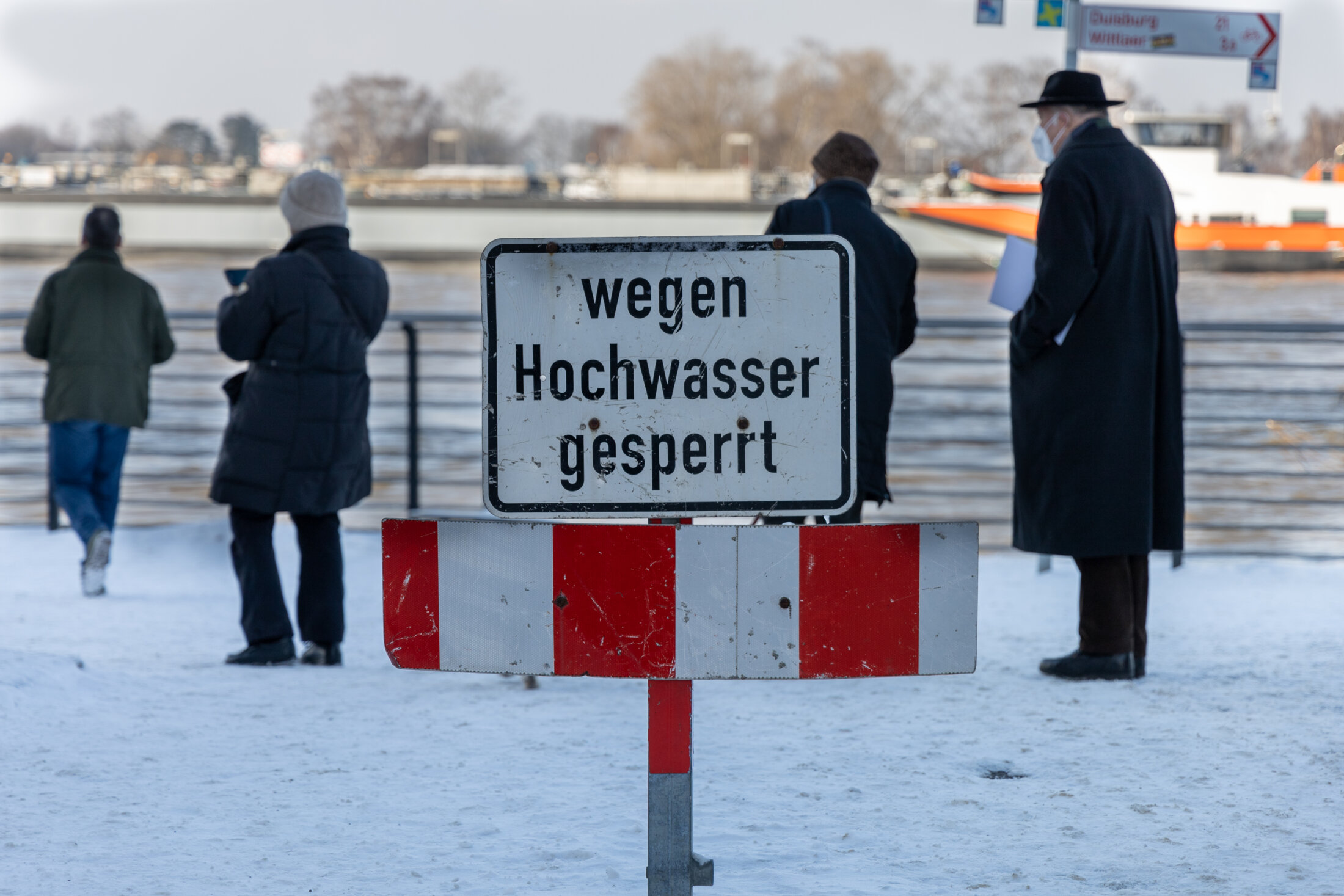 Hinweisschilder warnen vor nassen Füssen am Rhein
