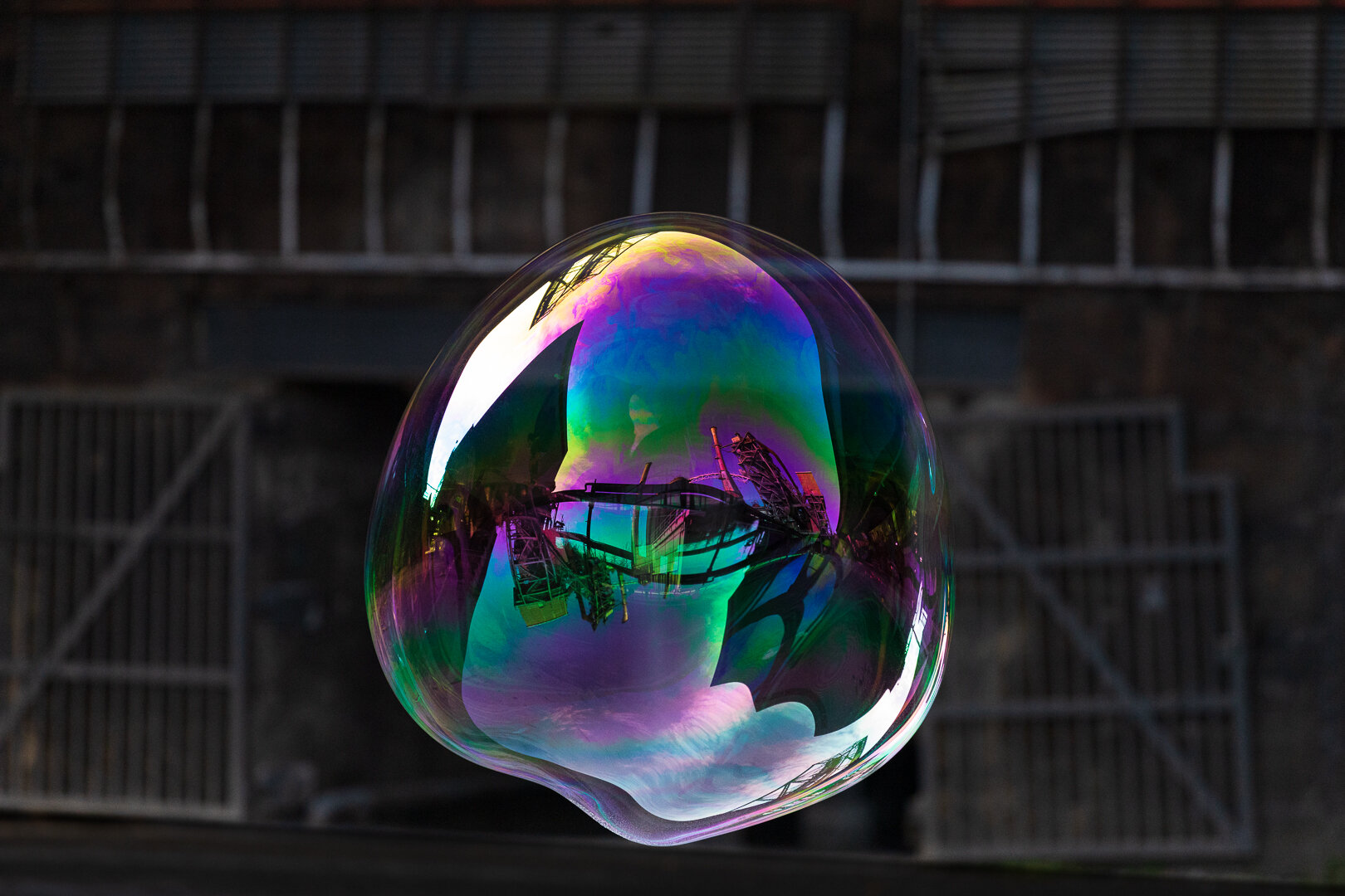 In der Seifenblase spiegelt sich die alte Hochofenanlage.