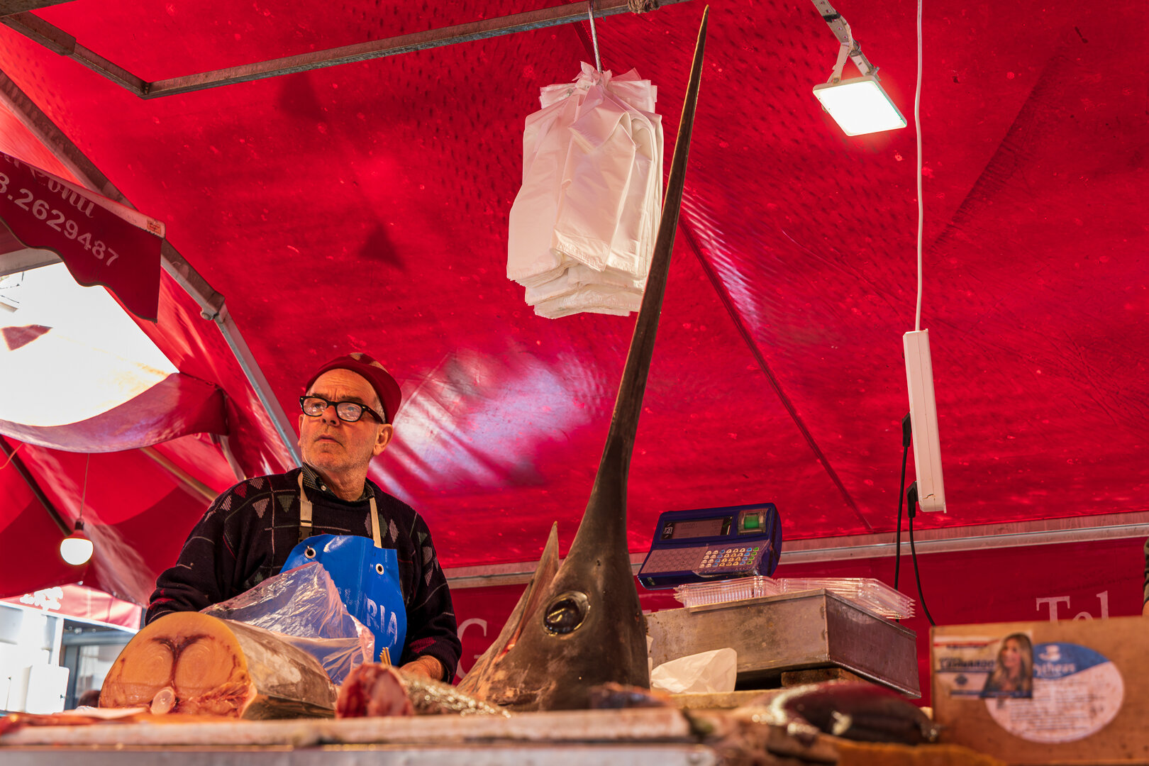 Fisch in allen Formen und Arten wird angeboten. Schwertfisch, Tunfisch, Tintenfische, Muscheln und noch soviel mehr