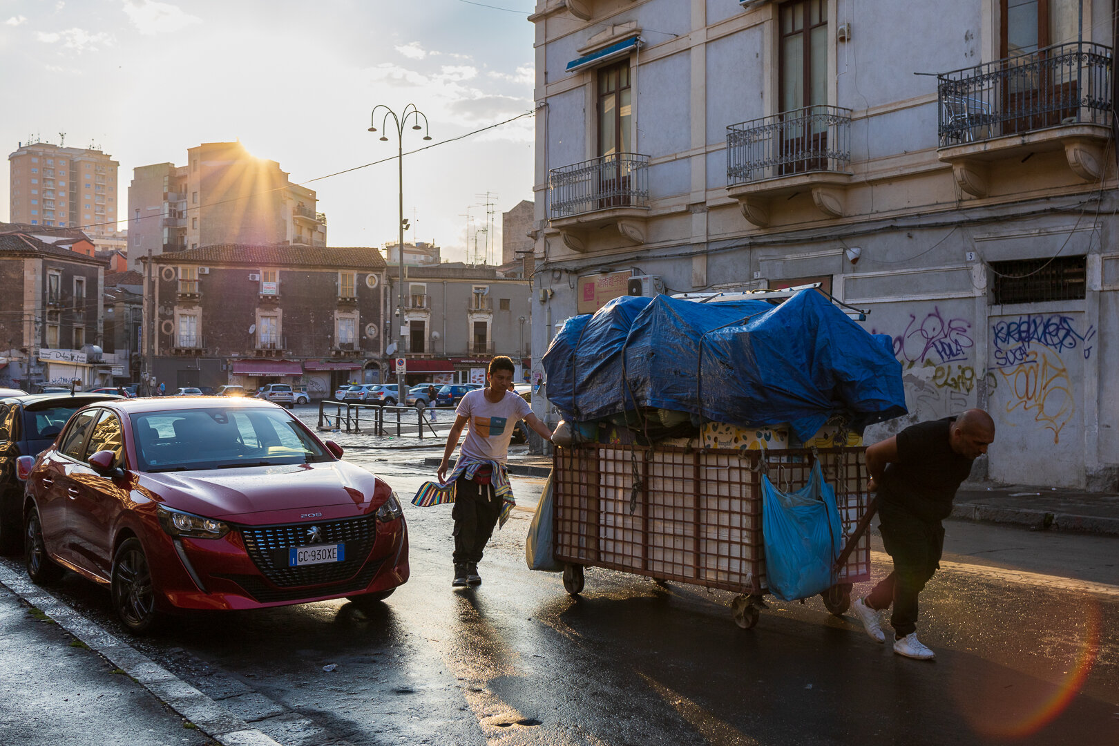 …heißt es für die letzten Standbetreiber des Marktes der ‚Piazza Grenoble‘ in Catania an diesem Abend. Mit dem Handkarren werden alle Waren wieder sicher verstaut.