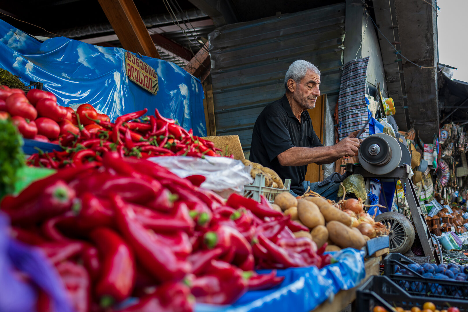 Auf den Bauernmarkt in Tbilisi bietet dieser Mann seinen Dienste an. Zwischen den Gemüseständen, mit teils scharfen Sachen wie diese Paprikas in Vordergrund, bietet er an an Messer zu schleifen. Für die Küche ist es ganz wichtig ein scharfes #Messer zu haben um Fleisch oder halt auch Paprika gut schneiden zu können.