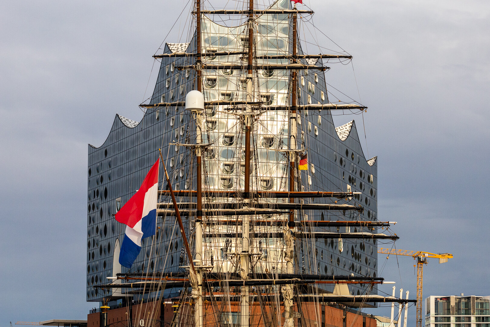 Die Elbphilharmonie in Hamburg soll von der Architektur wie ein Segel aussehen. Das passt auch ganz gut, im September stand das Segelschiff “Sea Cloud Spirit” genau passend vor der ‚Elphi‘. Es sieht so aus als ob es voll ‚aufgetakelt‘ wäre und bereit in See zu stechen.