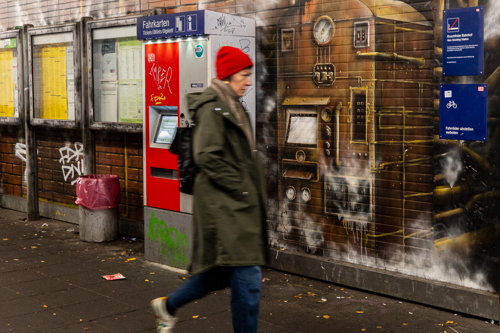 Grad stehen alle Züge still. Da werden auch die Fahrkartenautomaten nicht benötigt. Weder der echte noch der Steampunk Streetart Graffiti Automat. Gehen in Köln Ehrenfeld