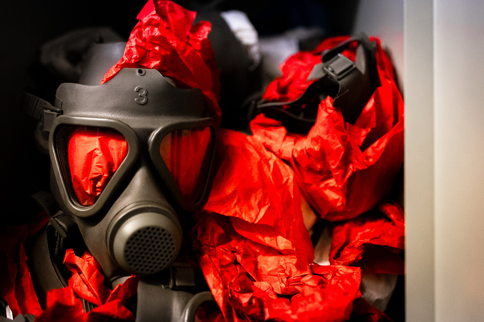 Die Maske des Teufels? Nein einfach nur eingelagerte Gasmasken im ehemaligen ‘Ausweichsitz des Landes NRW.Bei einer Fotoveranstaltung in diesem Bunker konnten auch Fotos im Lager gemacht werden