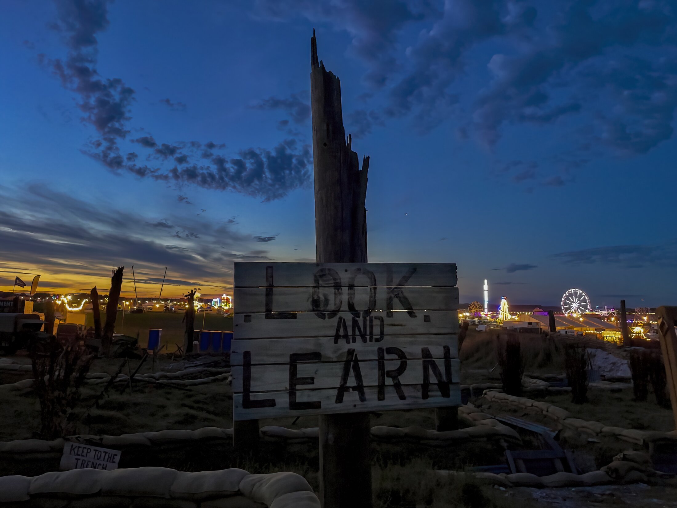 Grade zur Nacht zeigen sich hier die harten Kontraste dieser Ausstellung. Die Schützengräben im Vordergrund