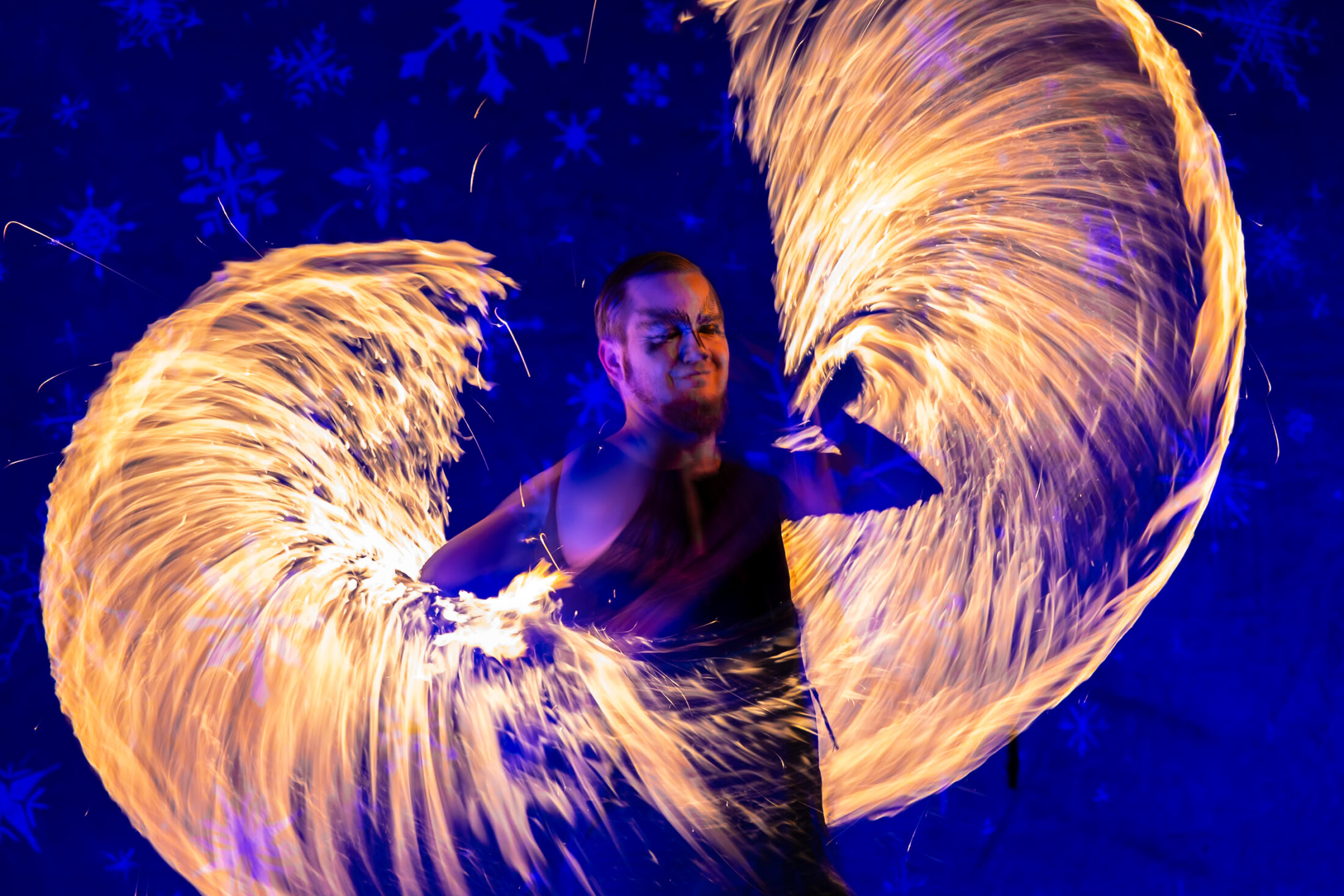 Bei der Feuershow von ‚Danse Infernale‘ geht es heiß her. Feuer wird in verschiedensten Formen kunstvoll durch die Luft geschleudert. So entstehen für die Zuschauer und auch in der Kamera ‚Magische Momente‘. Dieses Bild sieht aus, als ob der Künstler Dorian Flügel aus Feuer bekommen hat.