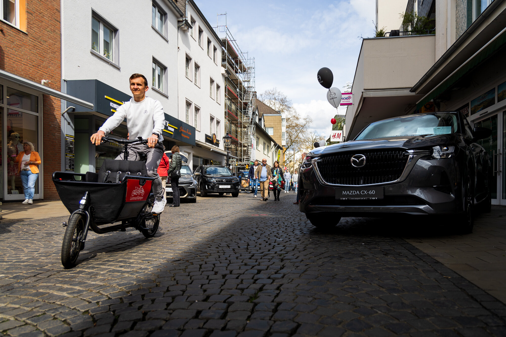 Zwischen den großen SUVs präsentiert sich das LaRa Lastenrad als flexible und kostenlose Alternative für die Mobilität in Ratingen.
