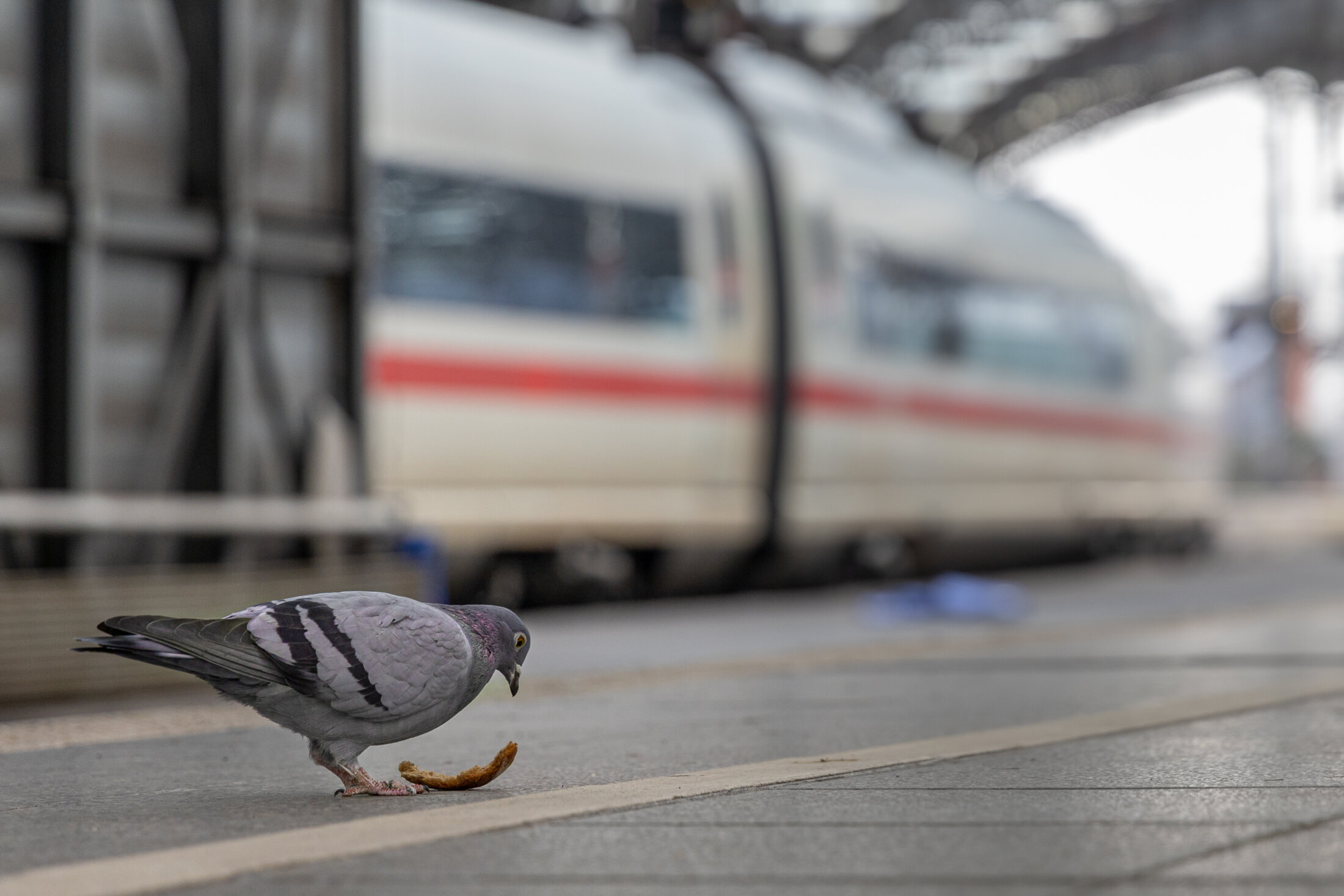 Mit Lockdown ist so wenig los wie selten am Kölner Hauptbahnhof. Einige Bahnsteige haben die Tauben nun fast für sich alleine